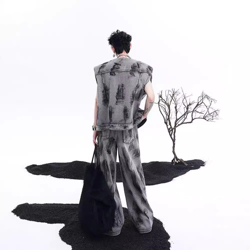 American Street Graffiti Padded Shoulder Sleeveless Denim Coat